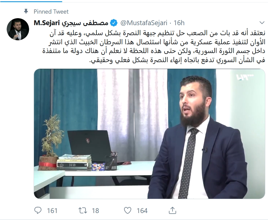 وأضاف، في تصريحات تلفزيونية نشرها عبر حسابه في تويتر: “آن الأوان لتنفيذ عملية عسكرية من شأنها استئصال هذا السر. طان الخبيث الذي انتشر داخل جسم الثورة السورية”.