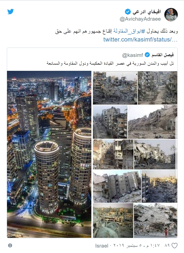 مقارنة بين المدن السورية و تل أبيب .. و أفخاي أدرعي يعلق