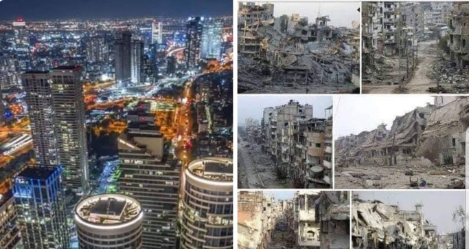 نشر الإعلامي السوري، فيصل القاسم، صورة قارن فيها بين لقطات لعدة مدن سورية مع تل أبيب بإسرائيل في ظل ما وصفه بـ”عصر القيادة الحكيمة”.