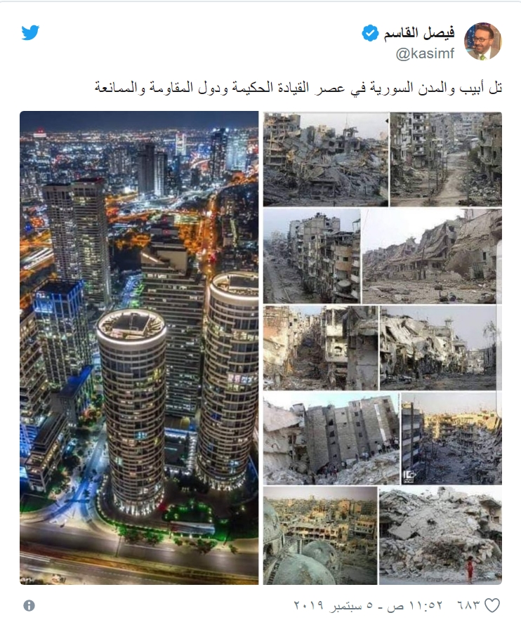 جاء ذلك في تغريدة للقاسم على صفحته بموقع التواصل الاجتماعي، تويتر، حيث قال في تعليق على الصورة: “تل أبيب والمدن السورية في عصر القيادة الحكيمة ودول المقاومة والممانعة”.