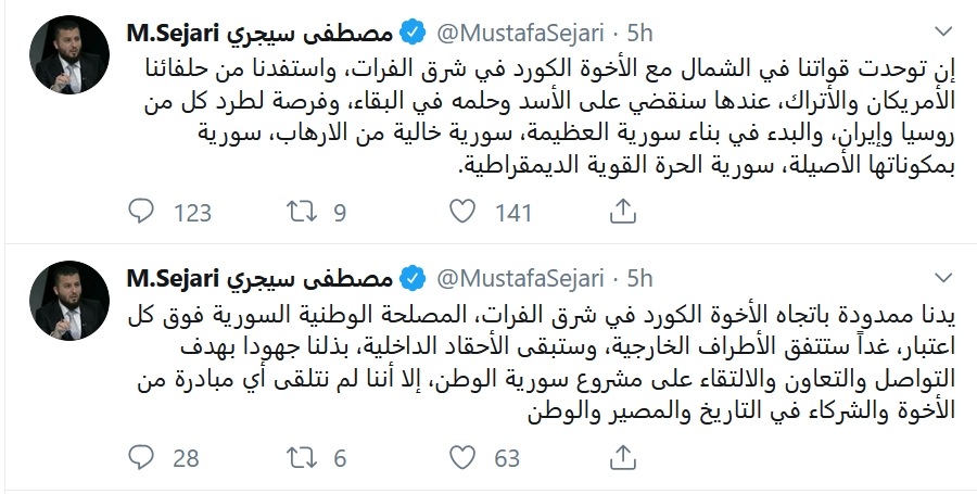 وعبر تغريدة له في تويتر، قال مصطفى سيجري، رئيس المكتب السياسي للواء المعتصم (الجيش الحر)، إن “يدنا ممدودة باتجاه الأخوة الكورد في شرق الفرات، المصلحة الوطنية السورية فوق كل اعتبار، غداً ستتفق الأطراف الخارجية، وستبقى الأحقاد الداخلية، بذلنا جهودا بهدف التواصل والتعاون والالتقاء على مشروع سورية الوطن، إلا أننا لم نتلقى أي مبادرة من الأخوة والشركاء في التاريخ والمصير والوطن”.