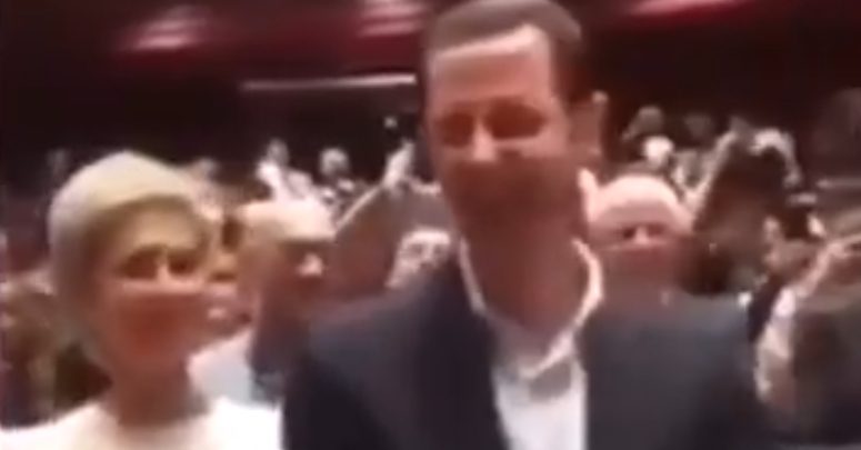 وقالت القناة: “تفاجأ الرئيس السوري بشار الأسد وزوجته أسماء خلال حضورهما فيلم دم النخيل في دار الأوبرا بغناء الجمهور له احتفالا بعيد ميلاده الذي يصادف اليوم”.