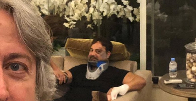 وروى فياض كيفية تعرض “فارس الغناء العربي” للحادث، وأرفق منشوره بصورتين من منزل عاصي بعد خروجه من المستشفى، والكدمات كانت واضحة عليه.