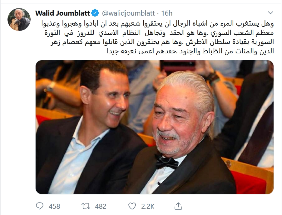 وقال جنبلاط عبر حسابته في تويتر: “وهل يستغرب المرء من اشباه الرجال ان يحتقروا شعبهم بعد ان ابادوا وهجروا وعذبوا معظم الشعب السوري، وها هو الحقد وتجاهل النظام الاسدي للدروز في الثورة السورية بقيادة سلطان الاطرش، وهاهم يحتقرون الذين قاتلوا معهم كعصام زهر الدين والمئات من الظباط والجنود .حقدهم اعمى نعرفه جيدا”.