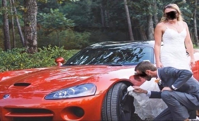 أمريكي يستخدم ثوب زفاف عروسه لتنظيف عجلة السيارة !