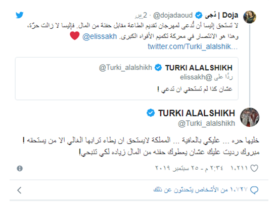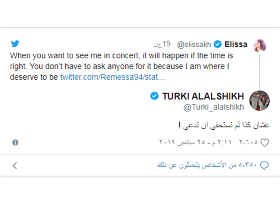 يبدو ان الفنانة اللبنانية اليسا اغضبت المستشار تركي ال الشيخ، رئيس هيئة الترفيه في #السعودية ، بعد تغريدة رفضت فيها ان يطالب احد بمشاركتها في احتفالات اليوم الوطني السعودي مؤكدة انها ستتواجد حيث تستحق.