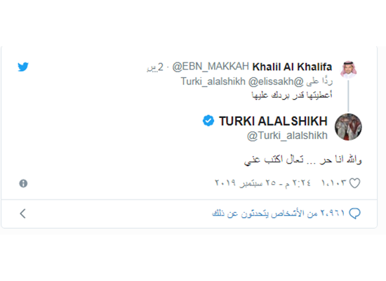 ولم يقتصر غضب ال الشيخ على اليسا بل وشمل احد المغردين الذين قال له : “أعطيتها قدر بردك عليها” ليرد عليه قائلا “والله انا حر … تعال اكتب عني”.