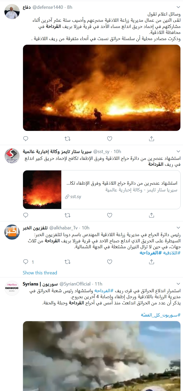 وكانت سلطات النظام في طرطوس أعلنت حالة الاستنفار، على خلفية الحرائق الكبيرة التي اندلعت في مساحات واسعة بالمحافظة .