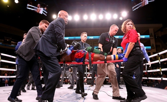 واستدعى حكم النزال الطاقم الطبي لتقديم الإسعافات الأولية للملاكم، ولكنه لم ينهض من أرض الحلبة، ليخرج منها على نقالة، فاقدا الوعي.