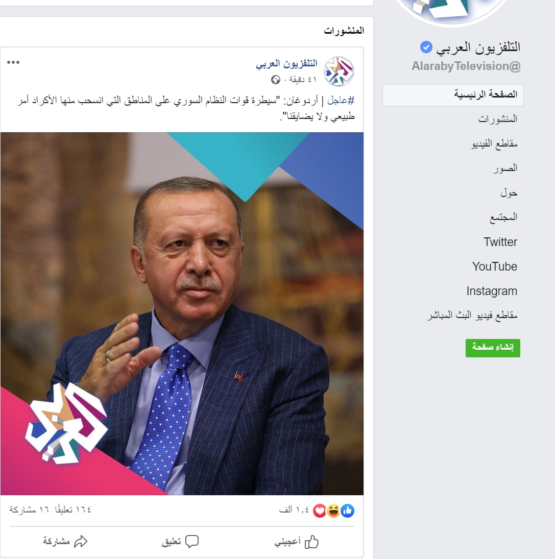 التلفزيون العربي عن أردوغان : ” سيطرة قوات النظام السوري على المناطق التي انسحب منها الأكراد أمر طبيعي و لا يضايقنا “