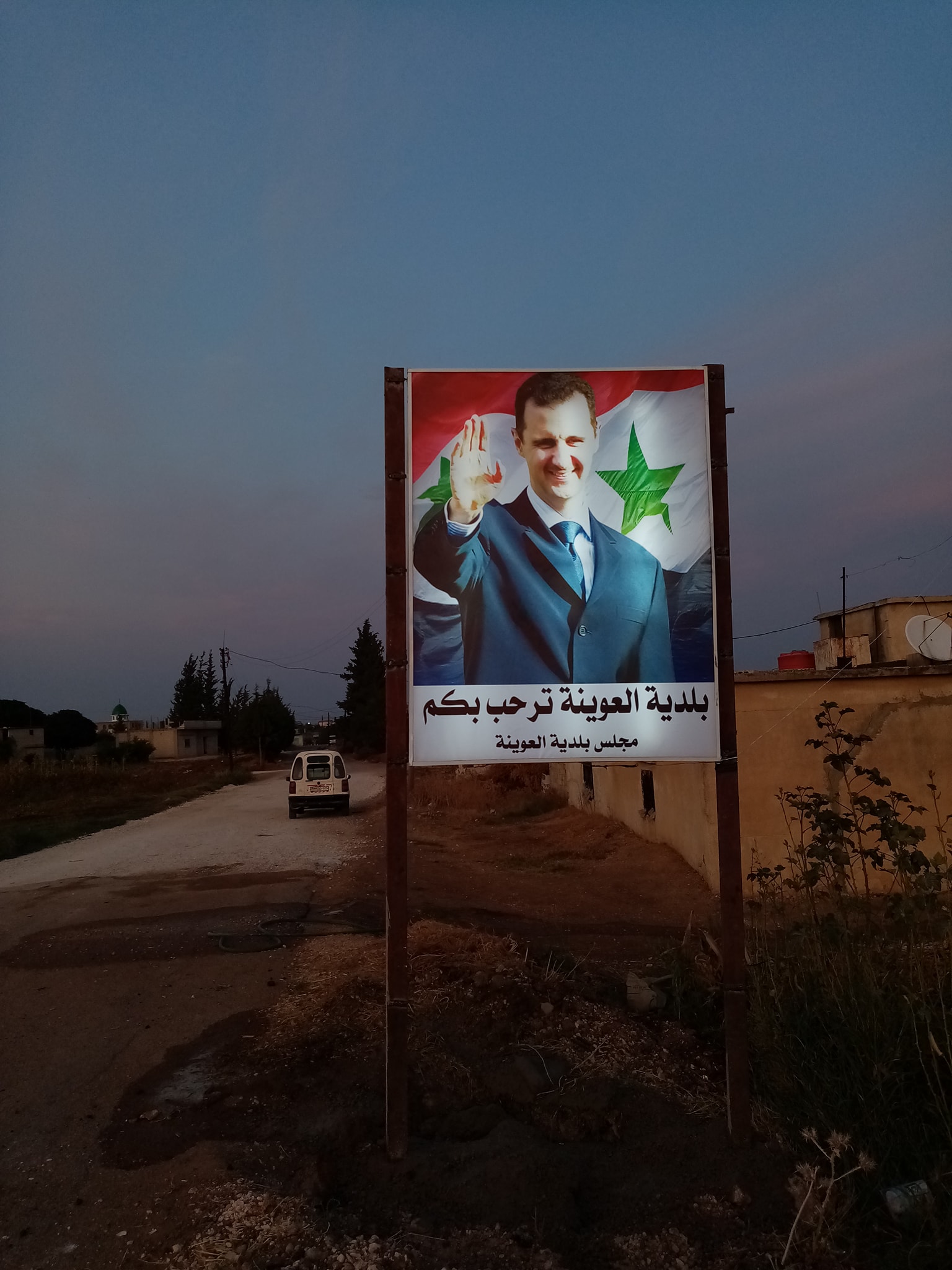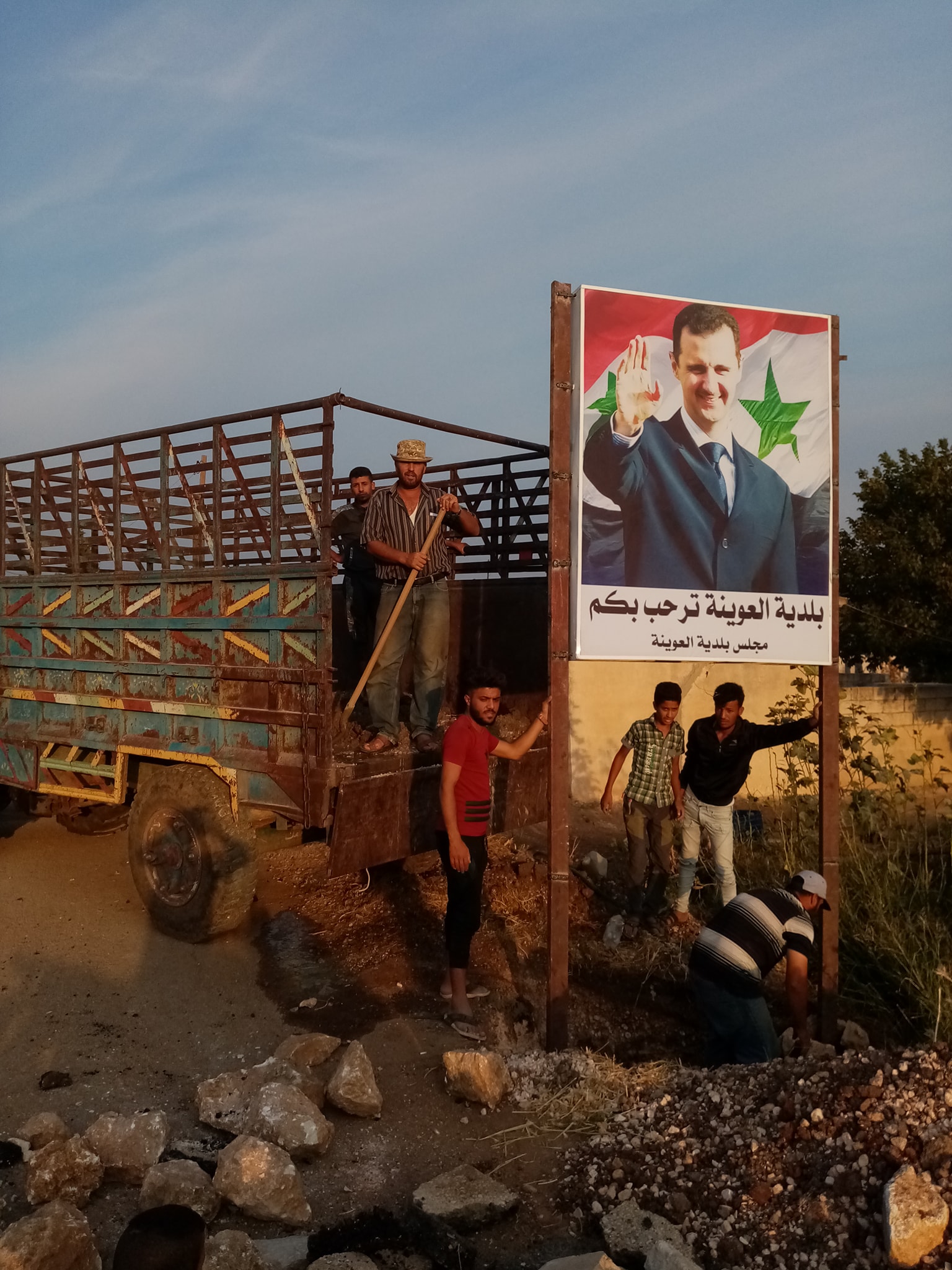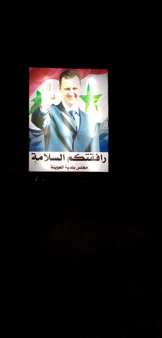 وذكرت صفحة محلية تغطي أخبار بلدة العوينة بريف حماة (بالقرب من السقيلبية)، الجمعة، أنه “بهمة رئيس مجلس بلدية العوينة الأستاذ محمدالحميدي تم تركيب لوحة ضوئية لقائد الوطن في مدخل العوينة.. كل الشكر للأستاذ محمد على اهتمامه الكبير بجعل قرية العوينة في أحسن منظر”.