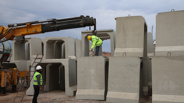 والحواجز الأسمنتية مضادة للرصاص ويبلغ ارتفاع الواحدة منها مترين، وبوزن 9 أطنان. (ANADOLU)