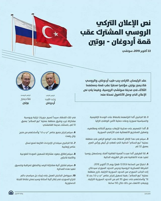 1. هي معروفة لا داعي لبيانات وهي تنص على اعادة كل المناطق لسيطرة النظام وكل المعارك التي حصلت هي عبارة عن مسرحيات متفق عليها وهي تسليم واستلام للمناطق الا القليل مثل حمص وداريا ونصيحة للمدنين الموجودين في ادلب من يستطيع الخروج خارج سورية فليخرج لان ظهور الطاغية الاسد في ادلب بوقت القمة الروسية التركية هو بداية لتسليم ادلب من قبل تركيا والمنطقة الامنة ليست سوى عن وهم للبشر من قبل تركيا ولكم ما حصل شرق الفرات عظة حيث تم تسليمها للطاغية ليتابع القتل والتهجر