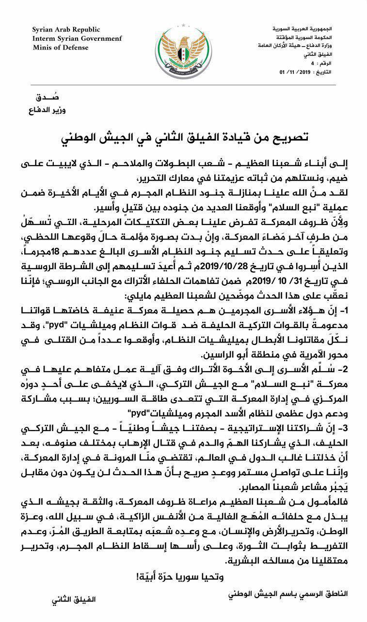 بيان لـ ” الجيش الوطني ” حول إعادة تسليم عناصر أسرى من جيش النظام لروسيا
