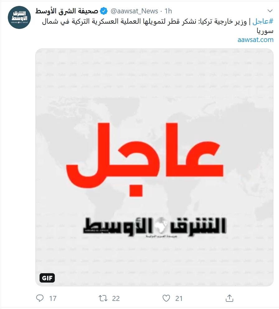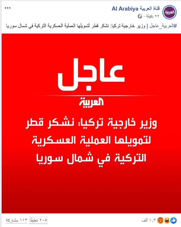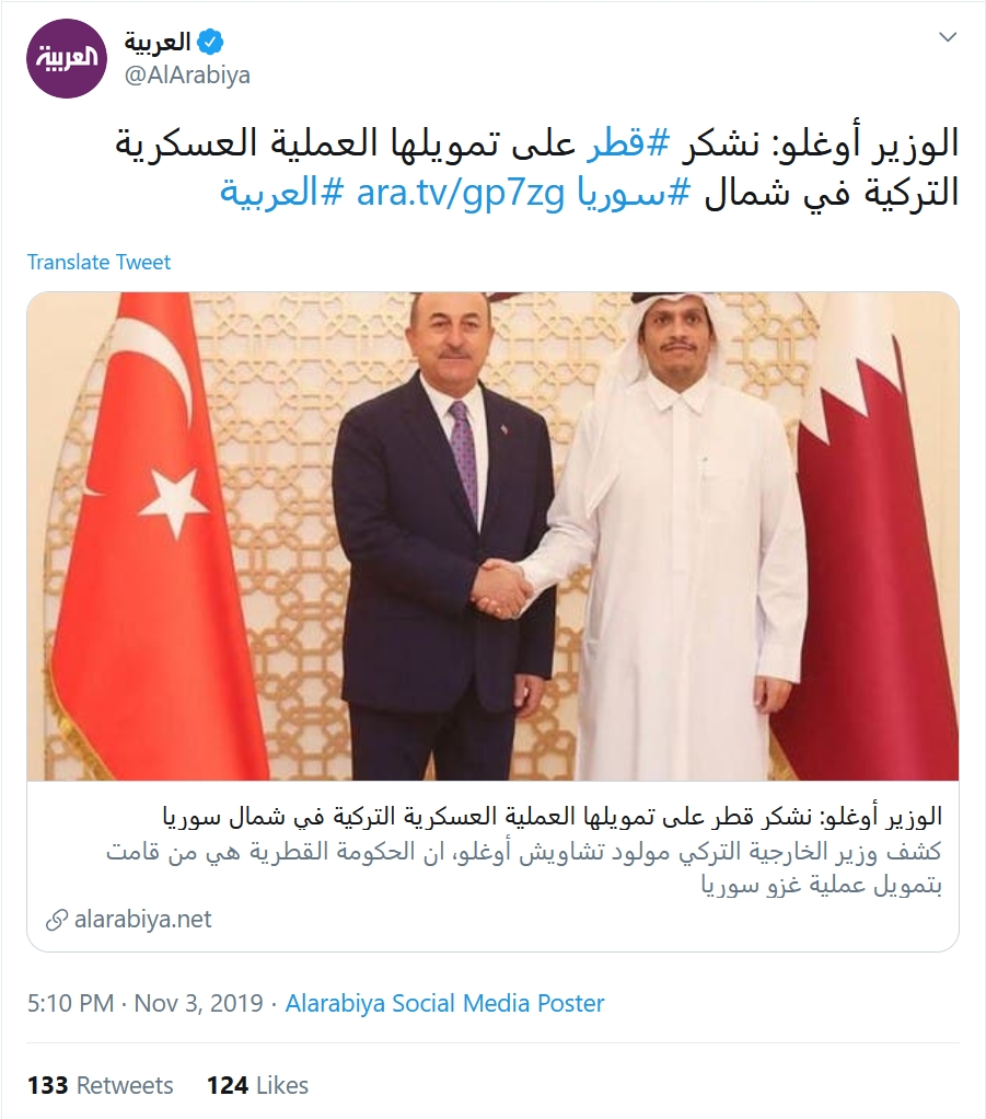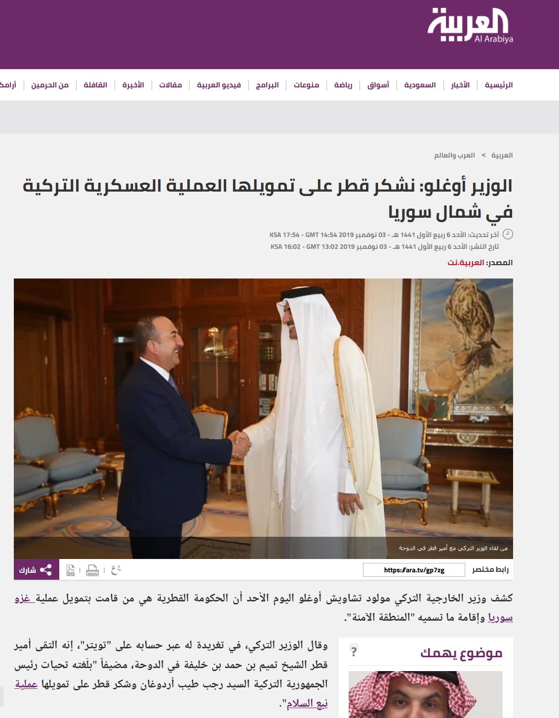 وجاء في خبر نشرته قناة العربية السعودية أن “وزير الخارجية التركي مولود تشاويش أوغلو كشف اليوم الأحد أن الحكومة القطرية هي من قامت بتمويل عملية غزو سوريا وإقامة ما تسميه المنطقة الآمنة”.