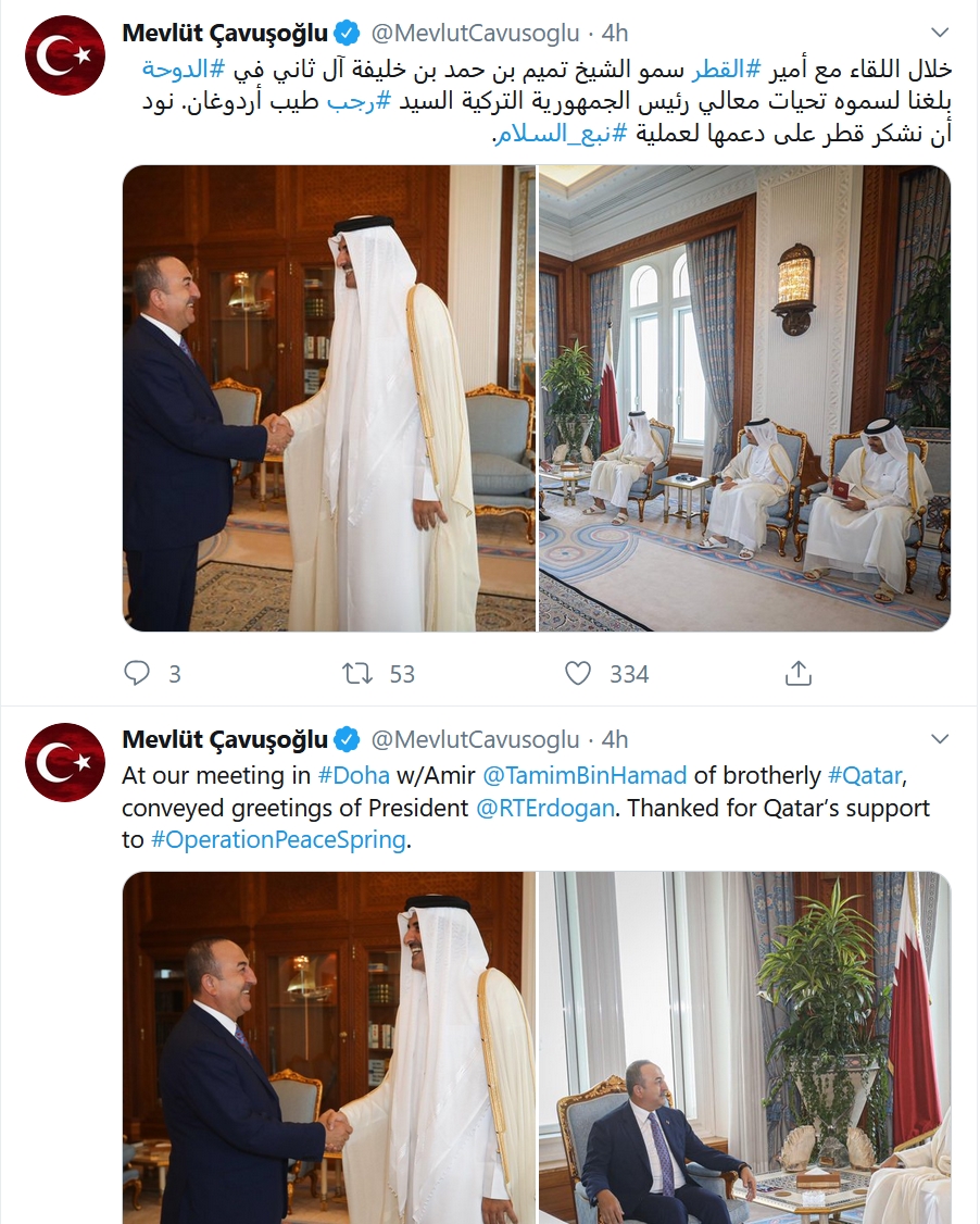 وأضافت القناة: “قال الوزير التركي، في تغريدة له عبر حسابه على تويتر، إنه التقى أمير قطر الشيخ تميم بن حمد بن خليفة في الدوحة، مضيفاً “بلّغته تحيات رئيس الجمهورية التركية السيد رجب طيب أردوغان وشكر قطر على تمويلها عملية نبع السلام”.