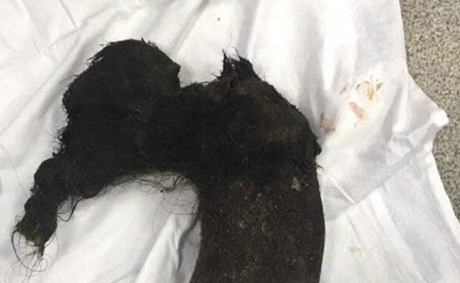 وأخرج الأطباء من باطنها كتلة متلاصقة من الشعر تشبه المعدة عن طريق عمل ثغرات وشقوق صغيرة في بشرتها.