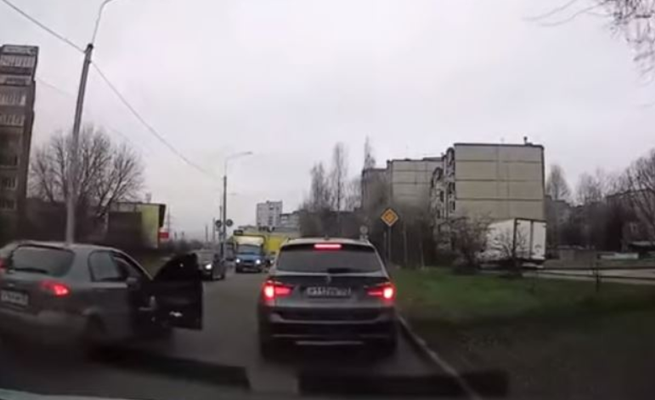 رصدت كاميرا للمراقبة مثبتة في إحدى السيارات لحظة سقوط امرأة من سيارة أخرى مسرعة في مدينة فلاديمير الروسية.