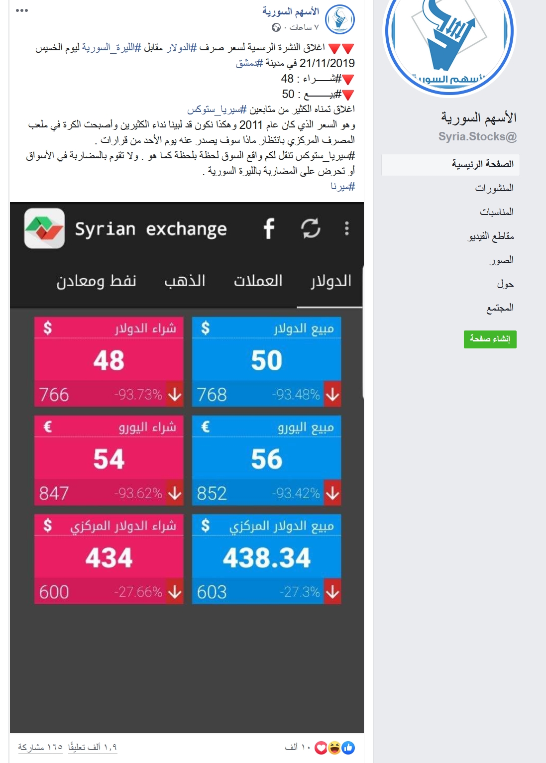 ورد تطبيق/ صفحة “الأسهم السورية” بهذه الطريقة على اتهامات بنك بشار الأسد المركزي والإعلام الموالي، التي تشير إلى أن صفحات تدار من الخارج (على رأسها الأسهم السورية) هي من تقوم بالتلاعب بسعر الصرف والتسبب بتراجع الليرة السورية.
