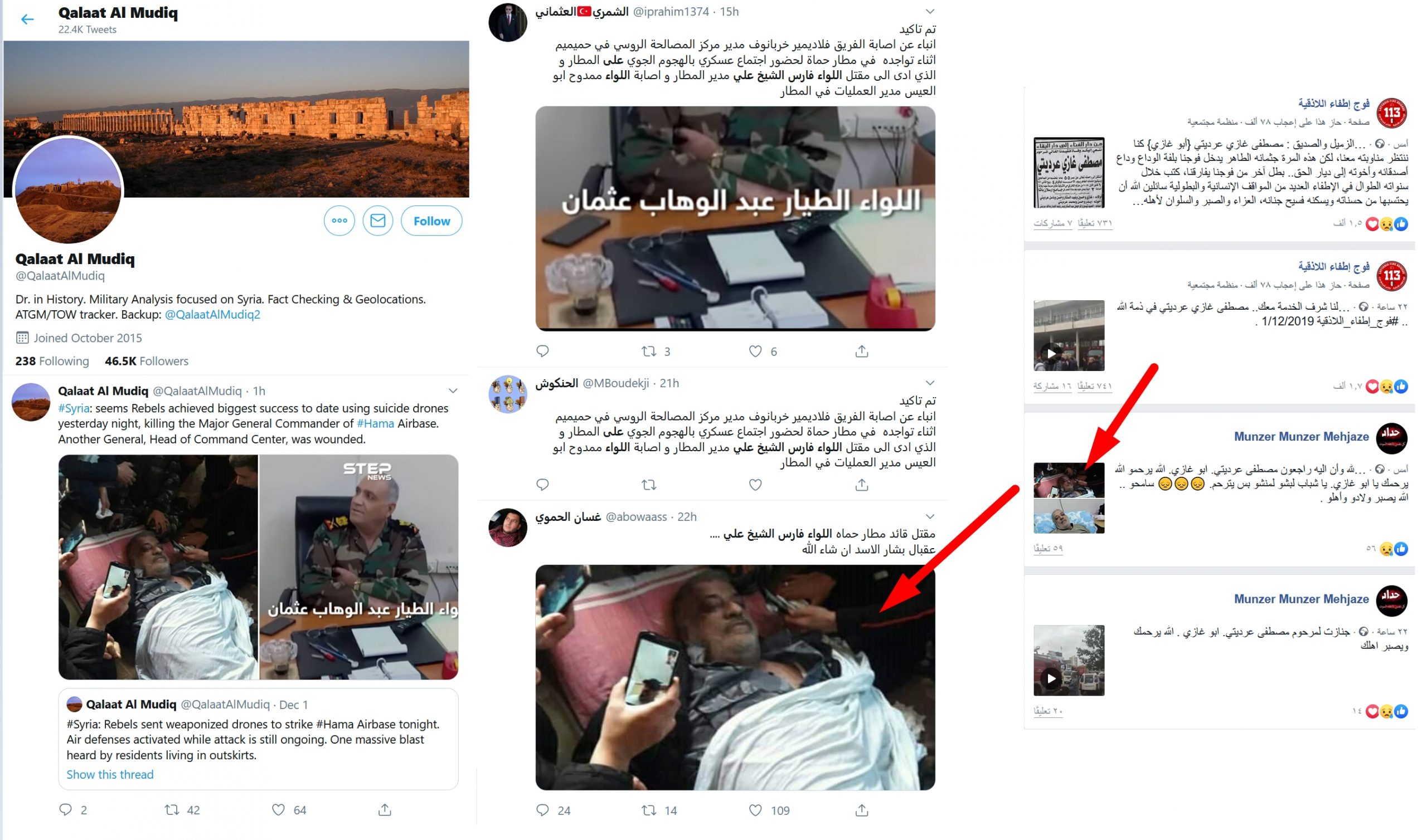 تناقل ناشطون معارضون صورة لرجل متوفى على أنها تارة للواء فارس الشيخ علي الذي قيل إنه مدير مطار حماة العسكري، وتارة للواء الطيار عبد الوهاب عثمان، والصورة ليست للاثنين.