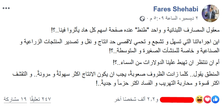 ومع استمرار التدهور والخسائر اليومية لليرة أمام الدولار، قال شهابي عبر حسابه في فيسبوك: “معقول المصارف اللبنانية وواحد طنط عنده صفحة اسهم كل هاد يأثروا فينا..؟!”.