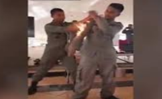 وفي مرحلة ما أشعل زميل له النار في منطقة البطن، وهذه المرة انبطح الرجل على بطنه فأطفأ اللهب، وتكرر ذلك عندما أشعل النار في ظهره.