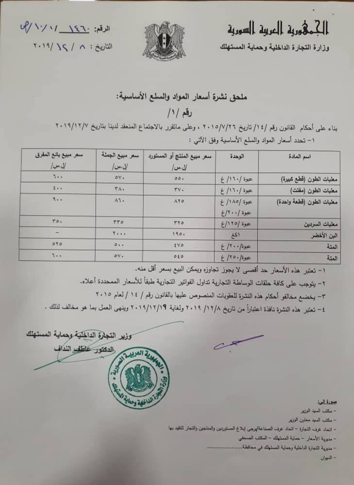 القائمة الجديدة التي أصدرتها وزارة التجارة الداخلية وحماية المستهلك السورية، خيبت آمال كثيرين كانوا ينتظرون تراجعا في الأسعار، خاصة مع الحديث الرسمي عن تحسن سعر صرف الليرة السورية، ومع ما يرافقه من حملات أسفرت عن إغلاق مئات المحلات المخالفة في التسعيرة، وفق المصدر ذاته.