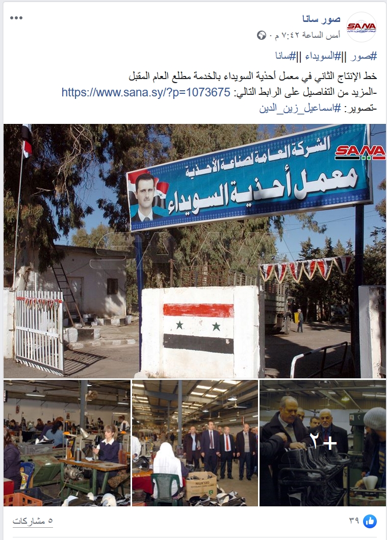 إعلام النظام : أعمال تجهيز خط الإنتاج الثاني في معمل أحذية السويداء تتواصل تمهيداً لإعادة الإقلاع .. و رأس الرئيس حاضر كالعادة