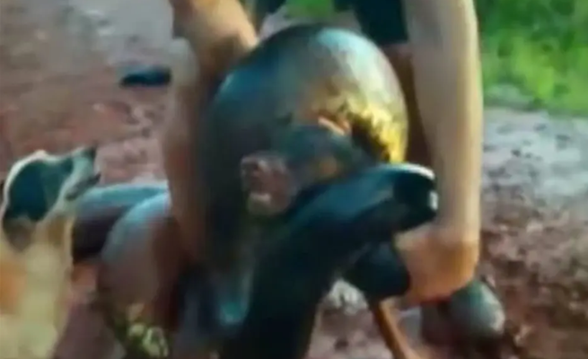 محاولة إخراج كلب من ثعبان بدأ يبتلعه ( فيديو )