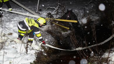 ألمانيا : فرقة إنقاذ كبيرة تنقذ حصاناً علق في حفرة مياة شديدة البرودة ( صور )
