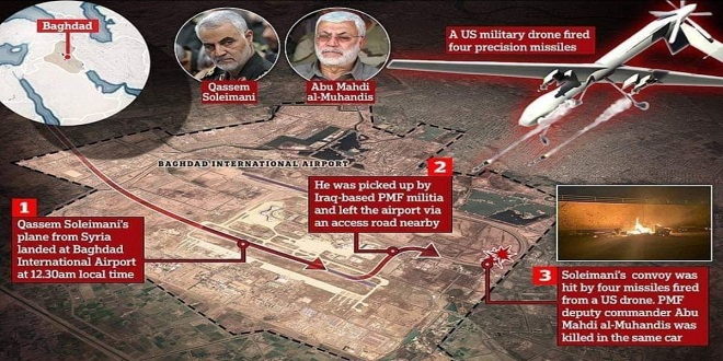 ونقلت رويترز عن قائدي ميليشيات ومصدرين أمنيين القول إن سليماني الذي قتل في غارة أميركية الخميس اجتمع بنائب رئيس هيئة الحشد الشعبي أبو مهدي المهندس وقادة ميليشيات عراقية موالية لإيران آخرين وأمرهم بشن هجمات ضد أهداف أميركية في العراق باستخدام أسلحة إيرانية متطورة.