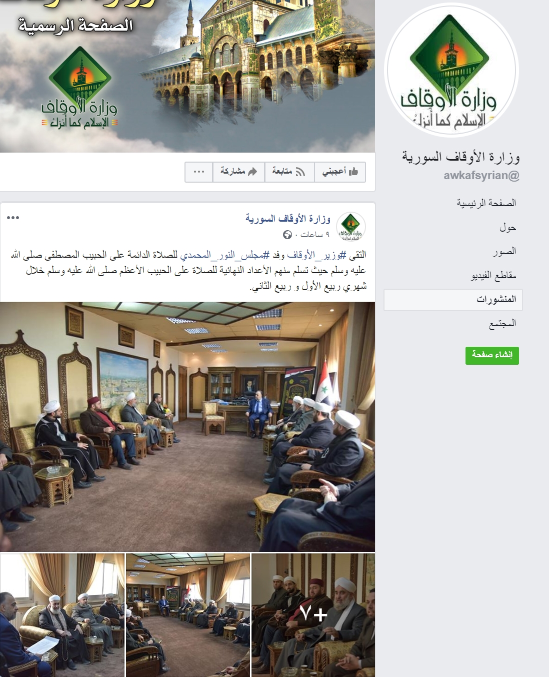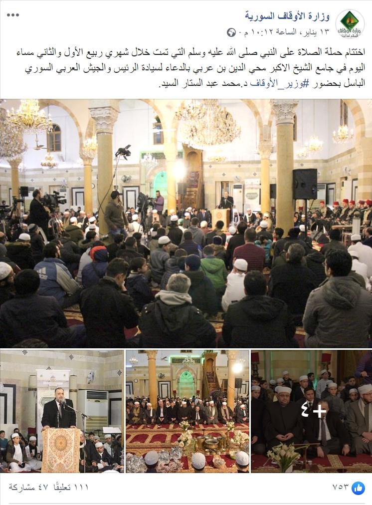 وفي منشور آخر نشرته الصفحة قبل أيام، تم الإعلان عن “اختتام حملة الصلاة على النبي صلى الله عليه وسلم التي تمت خلال شهري ربيع الأول والثاني في جامع الشيخ الاكبر محي الدين بن عربي بالدعاء لسيادة الرئيس والجيش العربي السوري الباسل بحضور #وزير_الأوقاف د.محمد عبد الستار السيد”.