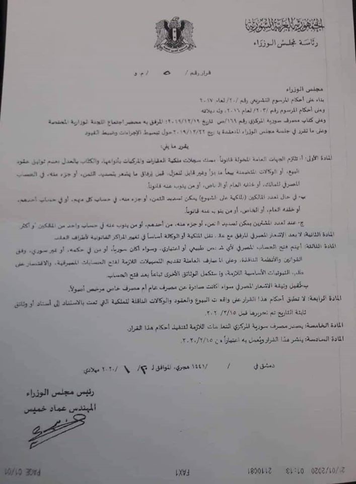 أصدرت حكومة بشار الأسد قراراً يقضي بإلزام من يرغب ببيع أو شراء عقارات أو مركبات، بتسديد الثمن أو جزء منه عبر حساب مصرفي.