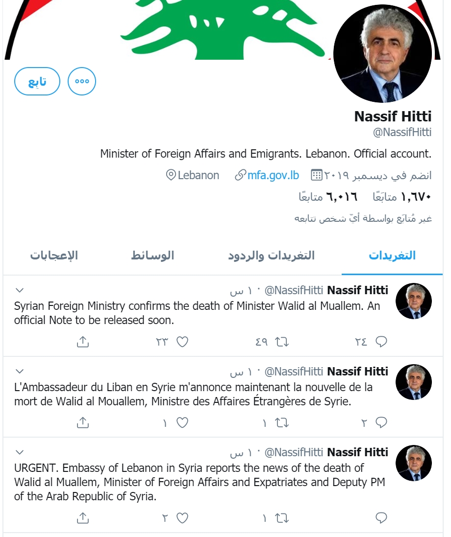 نشر حساب منسوب لوزير الخارجية اللبناني الجديد “ناصيف حتي”، عبر تويتر، تغريدة جاء فيها أن “وزارة الخارجية السورية أكدت وفاة وزير الخارجية وليد المعلم وأن بياناً رسمياً سيصدر قريباً”.
