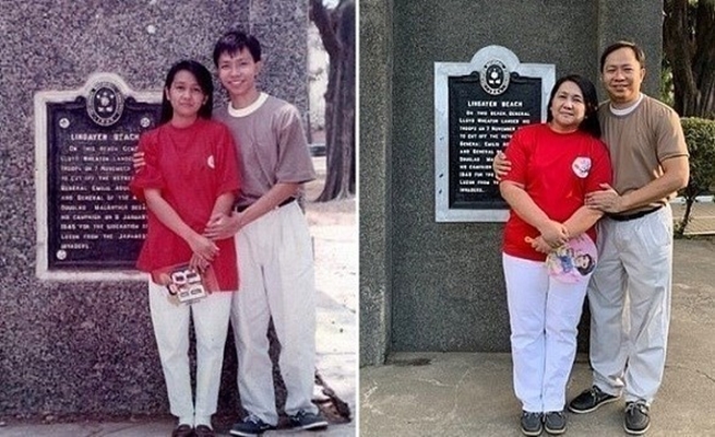 وشارك راي بوزون (21 عاماً) صورتين على تويتر، تم التقاطهما بفاصل نحو 3 عقود لوالديه، وهما يقفان بالقرب من نصب تذكاري، على شاطئ لينغاين في الفلبين.