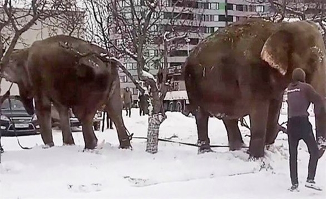 هرب فيلان من السيرك للتنزه وسط الثلوج بعد إصابتهما بالملل على ما يبدو، حيث استيقظ أهالي مدينة روسية على صوت غريب في الشارح ففوجئوا برؤية فيلين يلعبان في الثلج بحرية وسط الشارع.