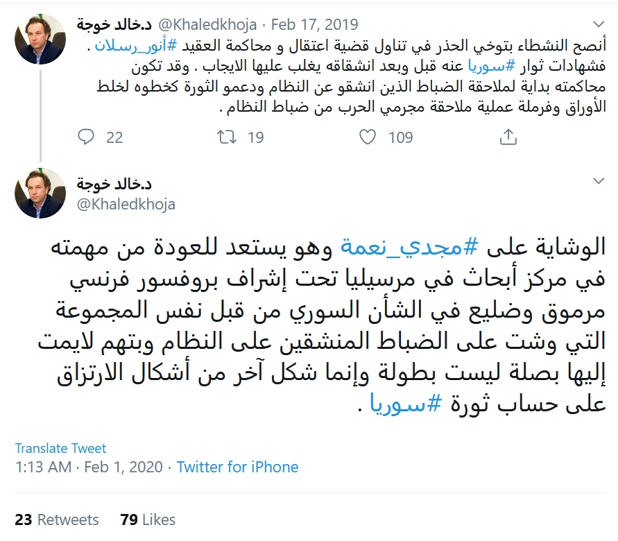 وقال خوجة عبر حسابه في تويتر: “الوشاية على #مجدي_نعمة وهو يستعد للعودة من مهمته في مركز أبحاث في مرسيليا تحت إشراف بروفسور فرنسي مرموق وضليع في الشأن السوري من قبل نفس المجموعة التي وشت على الضباط المنشقين على النظام وبتهم لايمت إليها بصلة ليست بطولة وإنما شكل آخر من أشكال الارتزاق على حساب ثورة سوريا”.