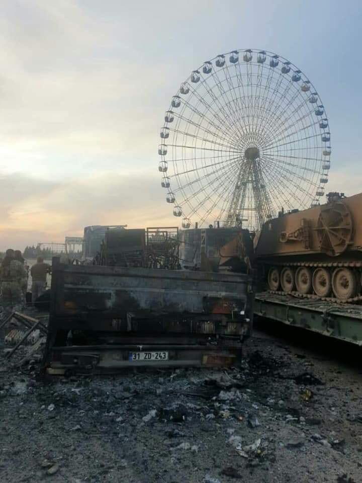 وأضافت: “الصور تظهر رتلا عسكريا للقوات التركية بعد تعرضه لقصف من قبل الجيش السوري قرب بلدة تفتناز في محافظة إدلب”.