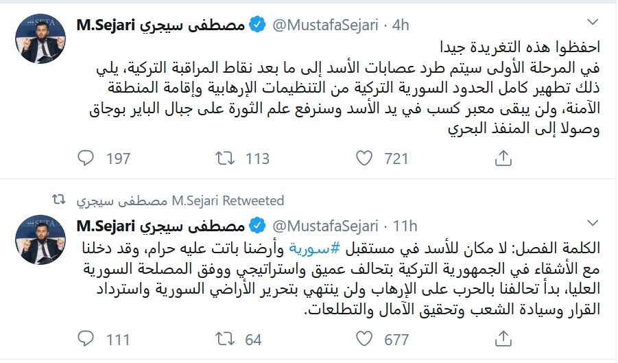 وقال مصطفى سيجري، رئيس المكتب السياسي للواء المعتصم (الجيش الحر): “احفظوا هذه التغريدة جيدا في المرحلة الأولى سيتم طرد عصابات الأسد إلى ما بعد نقاط المراقبة التركية، يلي ذلك تطهير كامل الحدود السورية التركية من التنظيمات الإرهابية وإقامة المنطقة الآمن”.