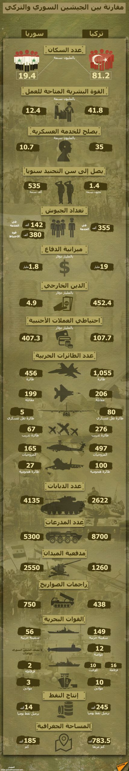 أورد موقع “غلوبال فير بور” الأمريكي، مقارنة بين الجيشين، السوري، الذي يحتل المرتبة رقم 55 عالميا، والتركي، الذي يحتل المرتبة رقم 11 بين أقوى 138 جيشا في العالم.