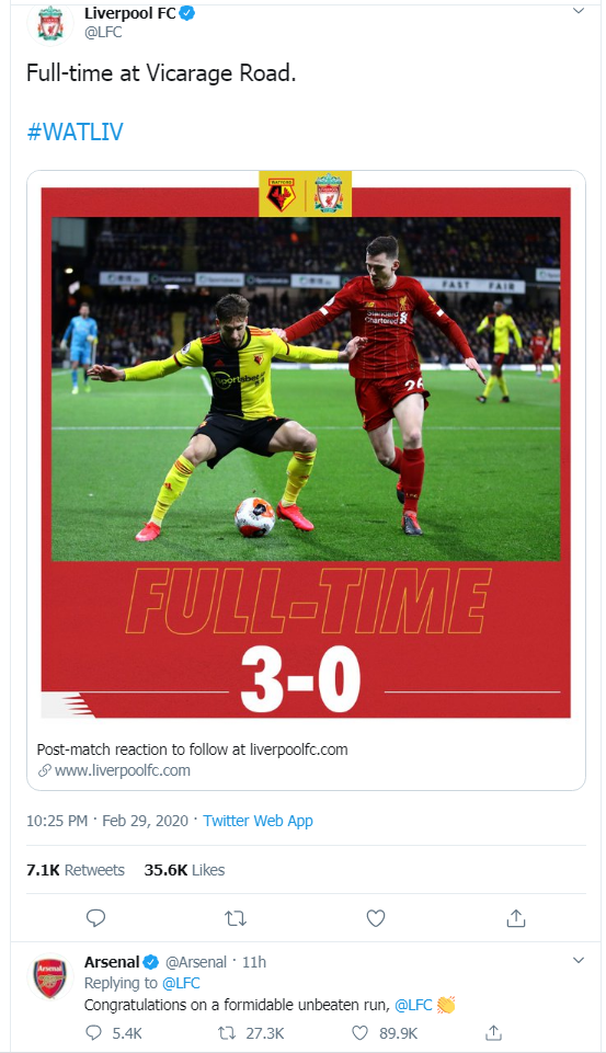 ورغم أن أرسنال كان يمني النفس بتلقي “الريدز” لأي خسارة قبل نهاية موسم “البريميرليغ” من أجل الحفاظ على رقم أسطورة التدريب الفرنسية التاريخي مع “المدفعجية”، لكنه التزم بعادة الأندية الأوروبية في التعامل بهكذا مواقف، حيث كتب الحساب الرسمي لنادي أرسنال على “تويتر” رسالة إلى ليفربول مفادها: “تهانينا على سلسلة هائلة من المباريات دون هزيمة”.