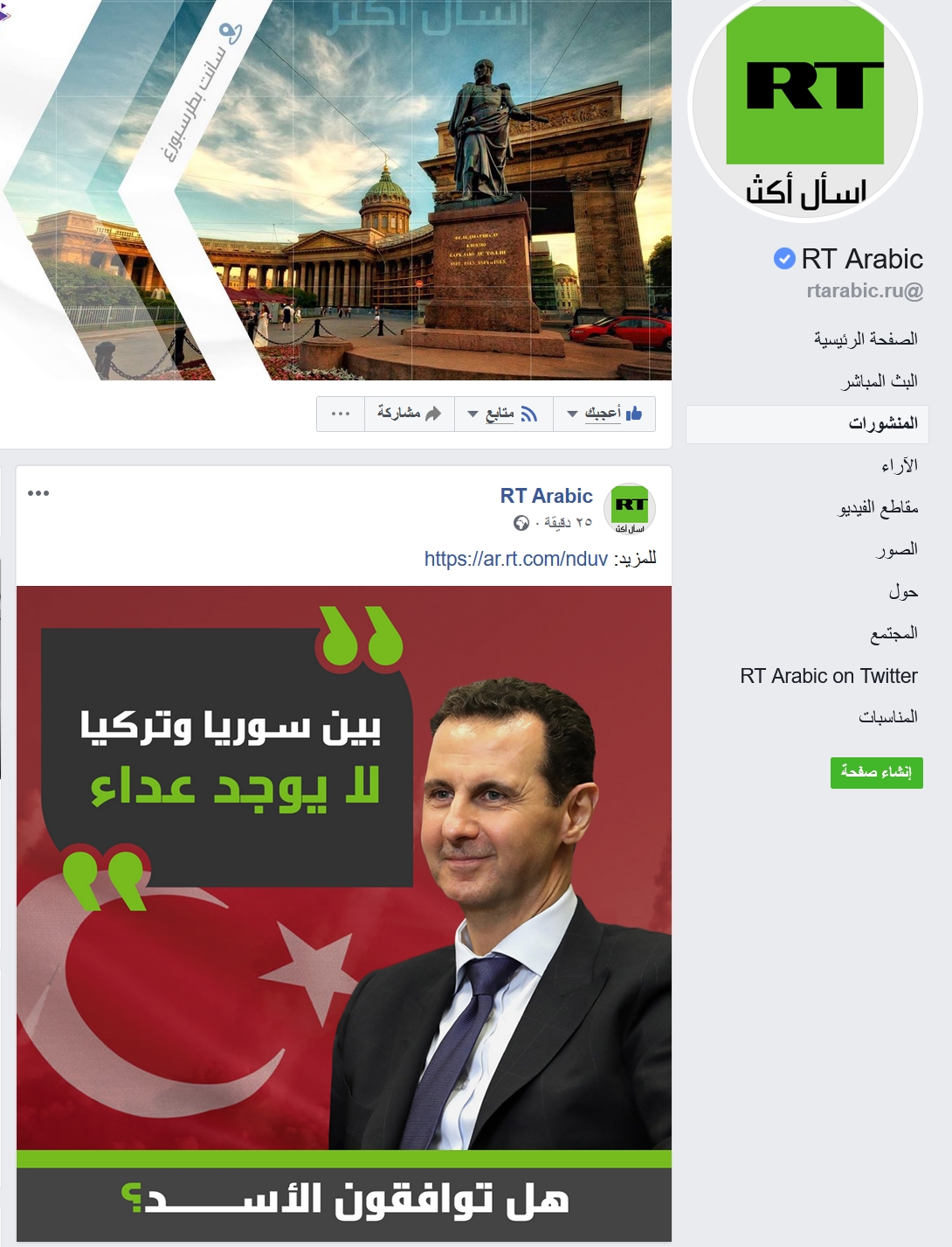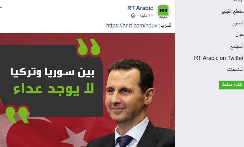 نشرت قناة “روسيا اليوم” الروسية عبر حسابها في فيسبوك خبراً بعنوان (“بين سوريا وتركيا لا يوجد عداء” هل توافقون الأسد؟).