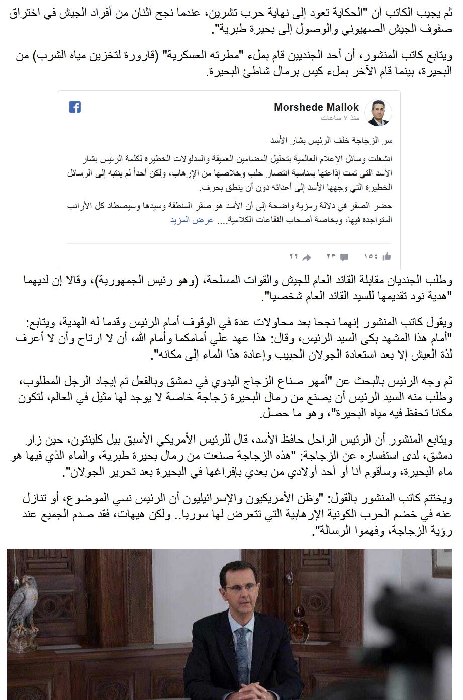 ” سر الزجاجة خلف الرئيس ” .. منشور ساخر من بشار الأسد يتحول إلى خبر يتغنى به على موقع قناة روسية !