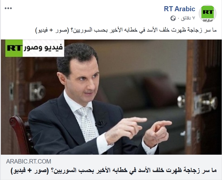 وقعت قناة “روسيا اليوم” الروسية، في فخ منشور ساخر لصفحة معارضة في فيسبوك، تم تناقله على نحو واسع، ونشرته عبر موقعها بعنوان “ما سر زجاجة ظهرت خلف الأسد في خطابه الأخير بحسب السوريين؟ (صور فيديو)”.