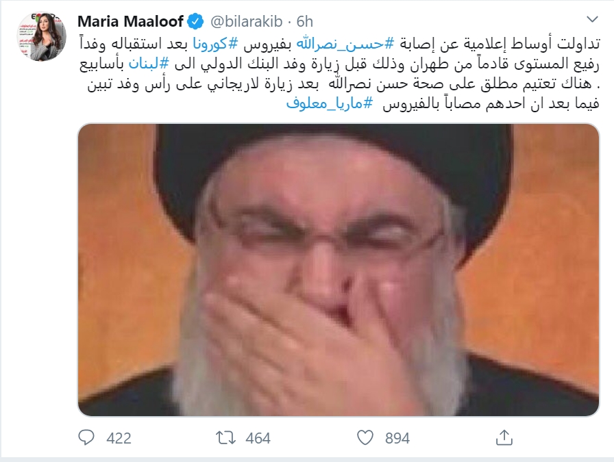 وقالت معلوف، إن أوساطاً إعلامية، تحدثت عن إصابة نصر الله بالفيروس، عقب استقباله وفداً رفيع المستوى قادماً من طهران، وذلك قبيل زيارة وفد البنك الدولي للبنان بأسابيع.