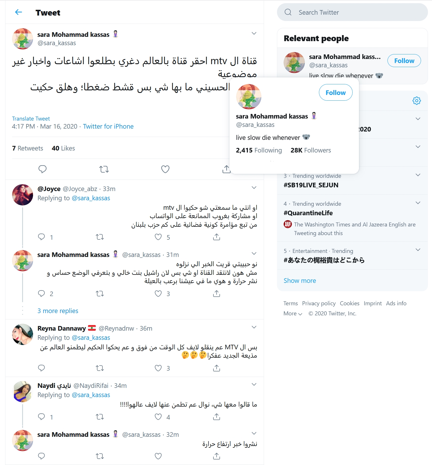 راشيل الحسيني ما بها شي بس قشط ضغطا؛ وهلق حكيت معها— sara Mohammad kassas 🧘🏻♀️ (@sara_kassas) March 16, 2020