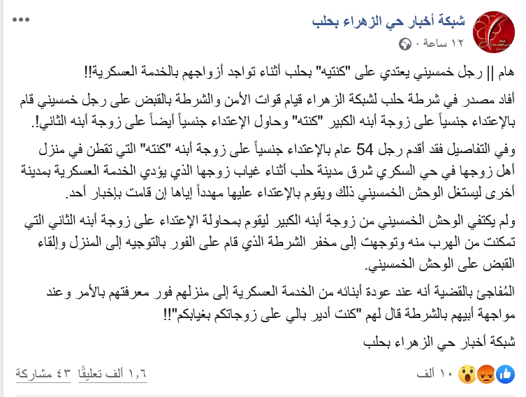 وذكر الإعلام الموالي أن “مصدراً في شرطة حلب أفاد بقيام قوات الأمن والشرطة بالقبض على رجل خمسيني قام بالإعتداء جنسياً على زوجة ابنه الكبير (كنته) وحاول الاعتداء جنسياً أيضاً على زوجة ابنه الثاني.