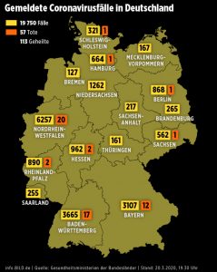 وعلى مستوى ألمانيا، بحسب إحصاءات الجمعة، وصل عدد المصابين بفيروس كورونا إلى 19750 شخصاً، وارتف عدد الوفيات إلى 57 شخصاً (20 في ولاية شمال الراين، و17 في بادن فورتمبيرغ و12 في بافاريا، وحالتين لكل من ولايتي هيسن وراينلاند بفالتس، وحالة واحد لكل من ولايات هيسن وبرلين وهامبورغ وشليزفيغ هولشتاين وساكسونيا).