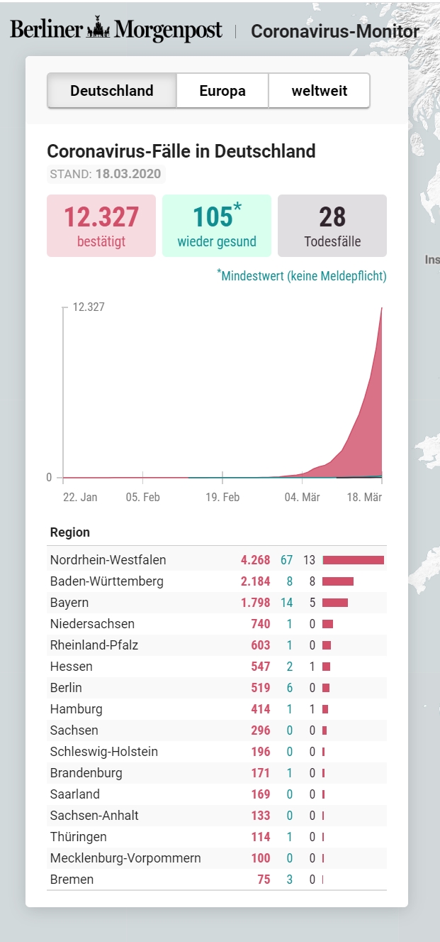 وما زالت ولاية شمال الراين في صدارة الولايات التي تسجل إصابات ووفيات وحالات شفاء، حيث بلغ عدد الإصابات حوالي 5000 آلاف، وعدد الوفيات 17، وعدد المتعافين 75 (الكلي +115).