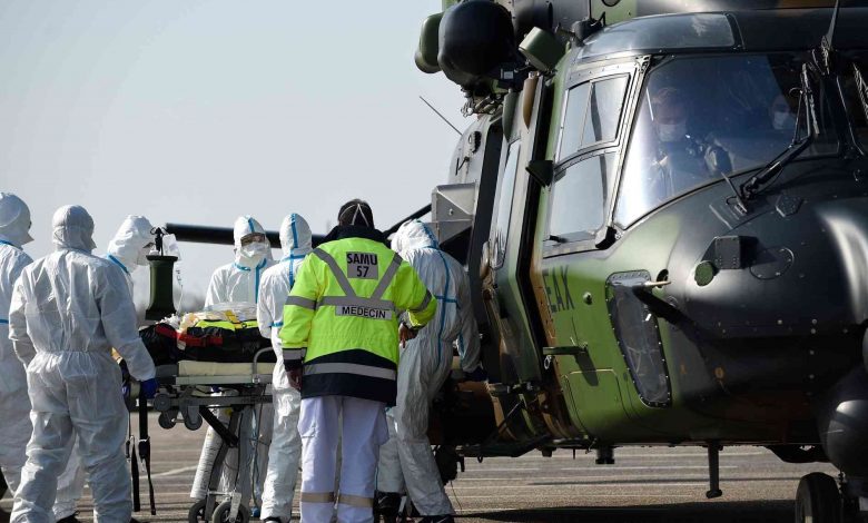 بعد إغلاق الحدود البرية بين الدول الأوروبية، قامت مروحيات الجيش الفرنسي بنقل المرضى المصابين بفيروس كورونا المستجد إلى مستشفيات ألمانيا لتلقي العلاج بعد تفاقم الأوضاع في شرق البلاد.